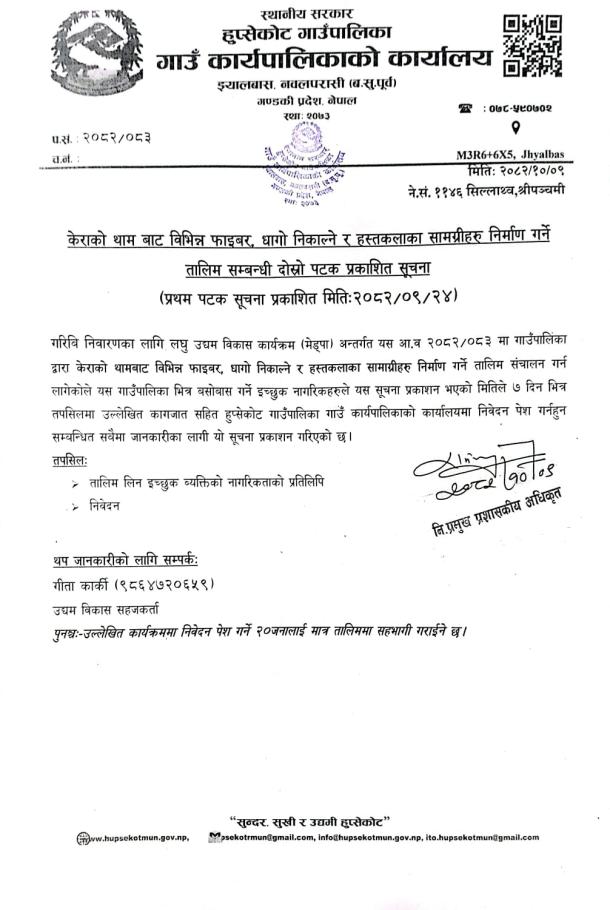 » केराको थामबाट विभिन्न फाइबर, धागो निकाल्ने र हस्तकलाका सामाग्रीहरु निर्माण गर्ने तालिम सम्बन्धी दोस्रो पटक प्रकाशित सूचना!!!