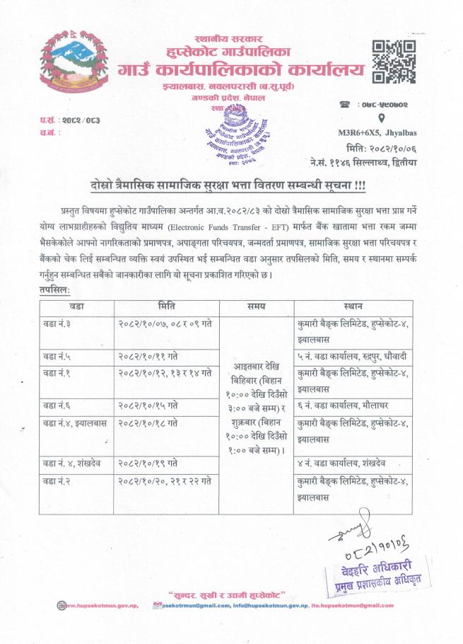 दोस्रो त्रैमासिक सामाजिक सुरक्षा भत्ता वितरण सम्बन्धी सूचना!!!