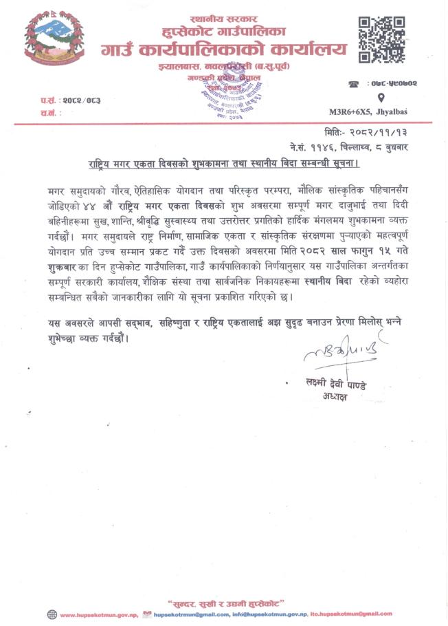 राष्ट्रिय मगर एकता दिवसको शुभकामना तथा स्थानीय विदा सम्बन्धी सूचना!!!