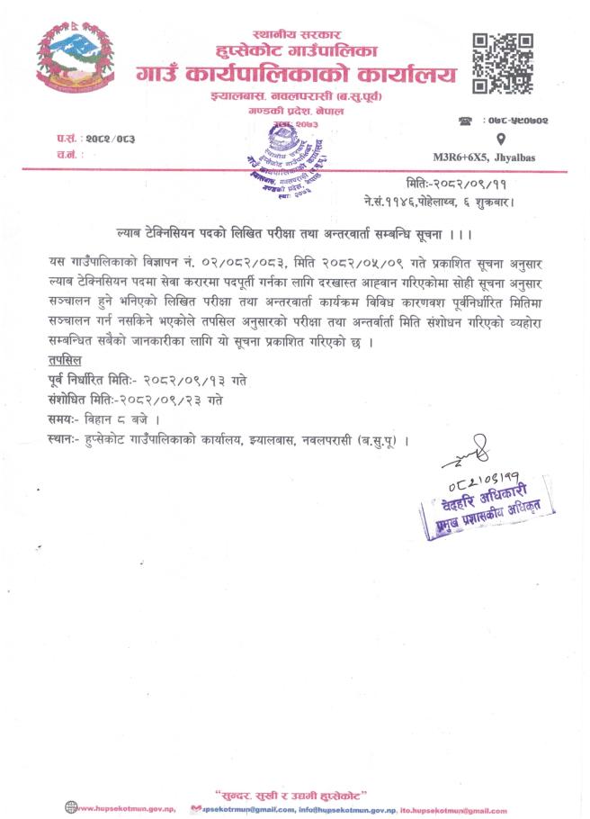 ल्याब टेक्निसियन पदको लिखित परीक्षा तथा अन्तरवार्ता सम्बन्धी सूचना!!!