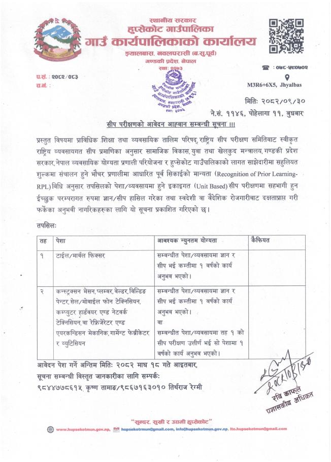 हुप्सेकोट गाउँपालिकाका युवा लाक्षित सिप मुलक तालिम संचालन सम्बन्धी सूचना!!!