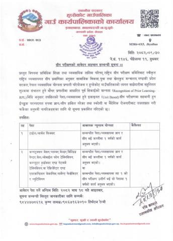 न्युनतम रोजगारीमा संलग्न हुनको लागि निवेदन दिने म्याद थप गरिएको सूचना ।