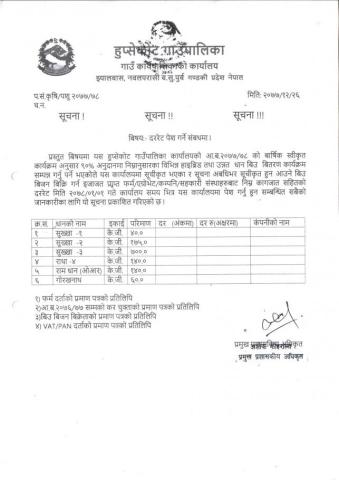 » कृषि शाखा द्वारा मिति २०७७/१२/२६ गते प्रकाशित दररेट पेश गर्ने सम्बन्धि सूचना !!!