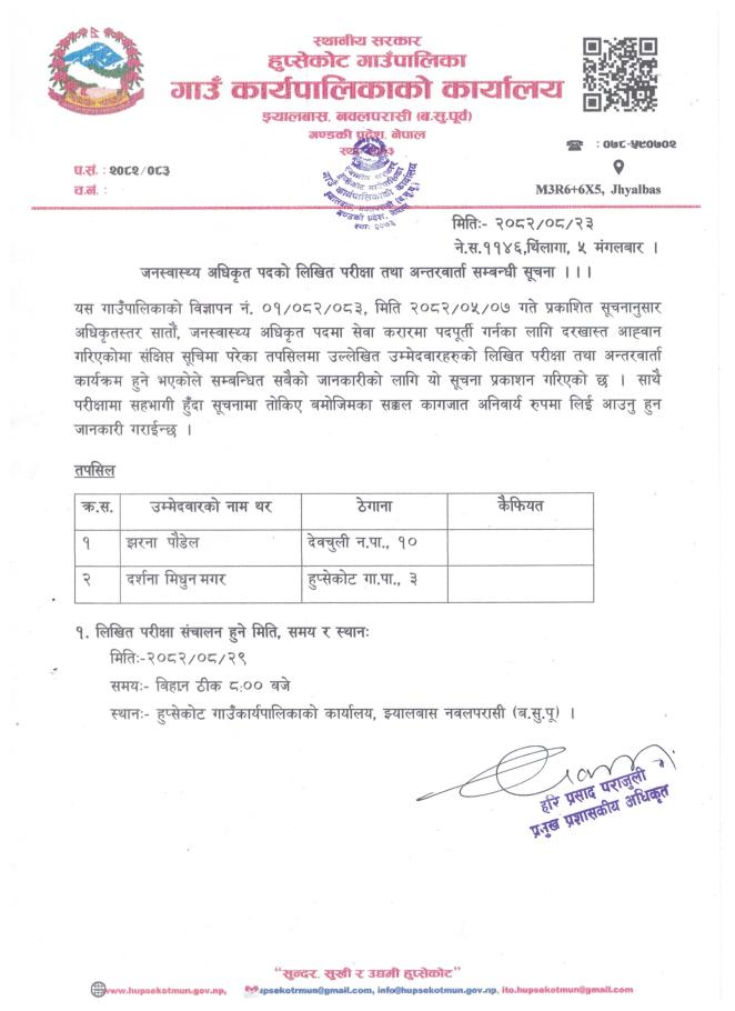 हुप्सेकोट गाउँपालिका स्वास्थ्य शाखा (अ.न.मी /अ.हे.व./का.स.)को अन्तिम नतिजा प्रकाशन सम्बन्धि सूचना !!!
