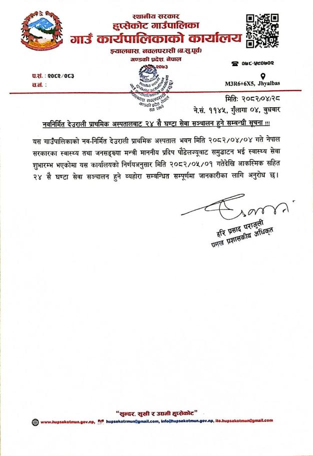 नवनिर्मित देउराली प्राथमिक अस्पतालबाट २४ सै घण्टा सेवा सञ्चालन हुने सम्बन्धी सूचना!!!