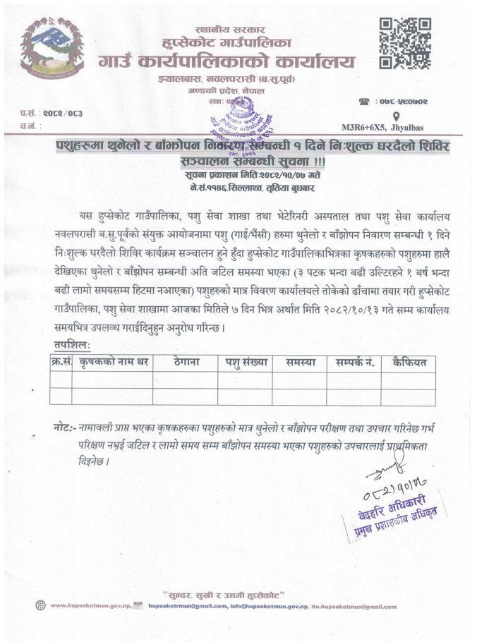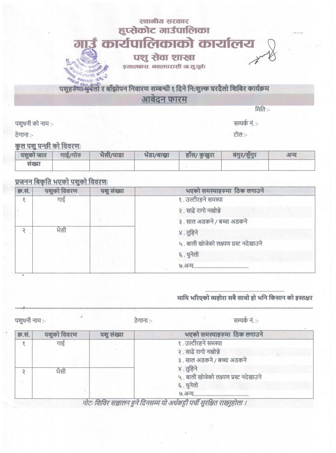 पशुहरुमा थुनेलो र बाँझोपन निवारण सम्बन्धी १ दिने निःशुल्क घरदैलो शिविर संचालन सम्बन्धी सूचना!!!