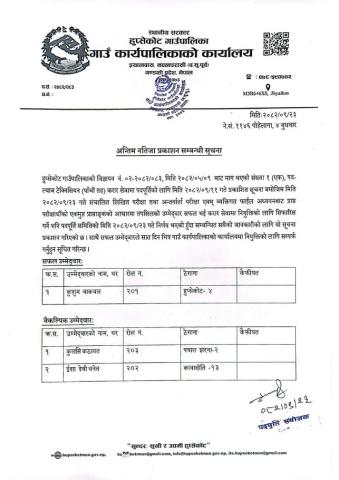 हुप्सेकोट गाउँपालिका स्वास्थ्य शाखा (अ.न.मी /अ.हे.व./का.स.)को अन्तिम नतिजा प्रकाशन सम्बन्धि सूचना !!!
