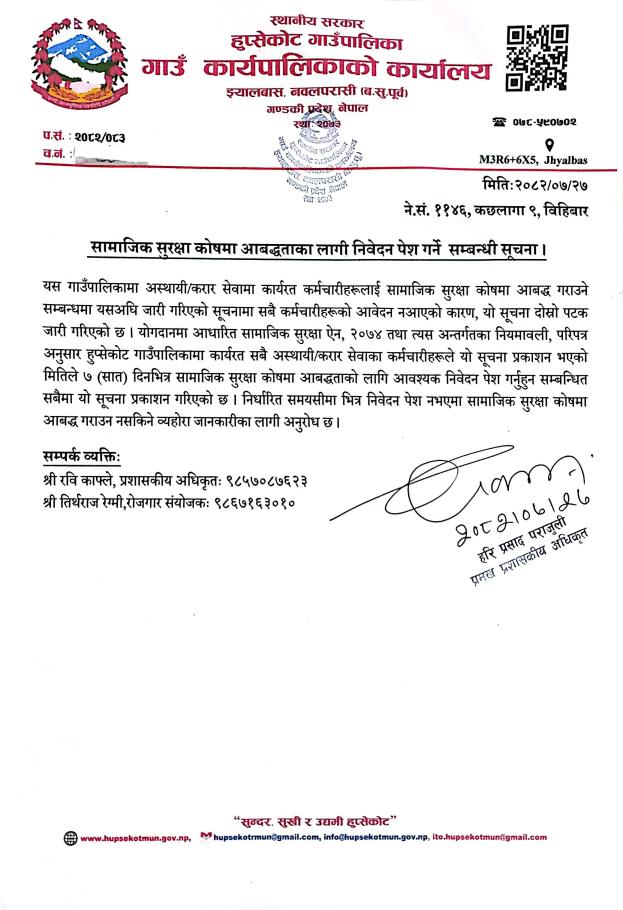 सामाजिक सुरक्षा कोषमा आबद्धताका लागि निवेदन पेश गर्ने सम्बन्धी सूचना!!!