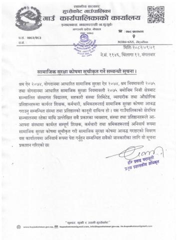 सामाजिक सुरक्षा कोषमा आबद्धताका लागि निवेदन पेश गर्ने सम्बन्धी सूचना!!!